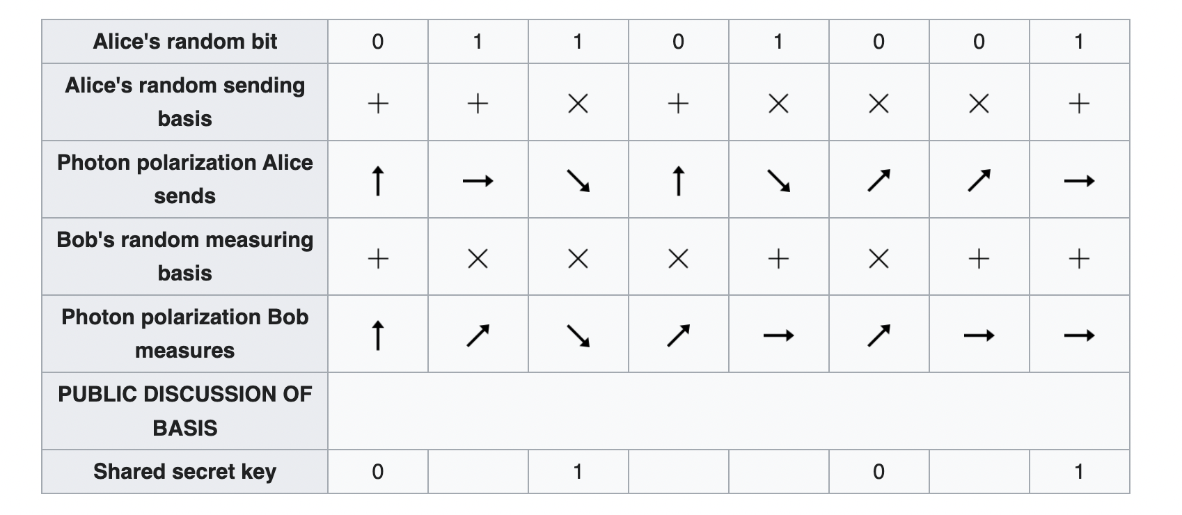 is 0 and the basis is +, the photon is vertically polarized (↑).